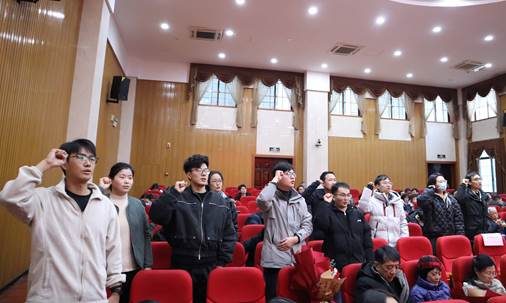 在何震副院长宣读新进教师名单后,顾帅老师作为新进教师代表发言。他从中南毕业又回到中南,对学校有深厚的感情。他感谢学校和学院提供了良好的平台,一定不辜负希望、不辜负前辈嘱托,不断努力。最后,他带领全体新进教师做了入职宣誓,他们响亮的声音里充满与学院共同进步的决心。