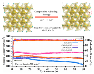 为解决该问题,该团队提出利用基于金属离子掺杂的成分调整策略,改善过渡金属二硒化物的结构稳定性及循环过程中的结构完整性,从而拓宽其工作电压的方法,使过渡金属二硒化物能在更宽的工作电压下获得更好的电化学性能。该研究以系列双金属沸石咪唑类金属有机框架化合物(BM-ZIFs)为原料,经过连续的碳化和硒化反应,得到了富氮碳包覆含不同金属离子掺杂的系列钴基二硒化物(CoM-Se2@NC, M=Ni, Cu, Zn)。电化学测试结果表明,在0.01-3.0 V的电压窗口下,未掺杂样品CoSe2@NC在循环初期就会发生明显衰减,相比之下,掺杂后的样品表现出更优异的循环稳定性。另外,循环后的SEM图显示在大电流循环过程中,掺杂后的样品具有更高结构完整性,进一步证明,适量的过渡金属离子掺杂可以通过改善过渡金属二硒化物的结构稳定性及完整性,有效拓宽其工作电压窗口,提高其在更宽的电压区间内的循环稳定性。该方法为优化过渡金属二硒化物的电化学性能提供了可行途径。