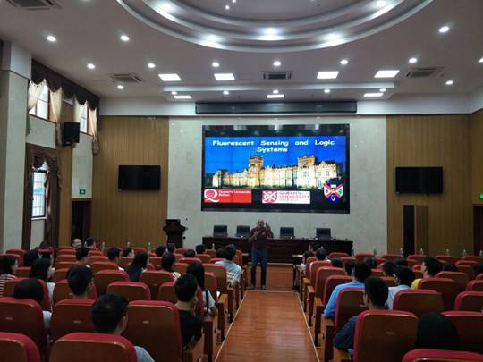 报告会上Amilra Prasanna De Silva用英文系统讲述了他近些年所研究的工作,即超分子光物理学,分子传感与逻辑门理论研究。Amilra Prasanna De Silva教授在介绍其研究工作时结合其研究方向的发展现状做了简要的分析令广大师生都大开眼界。最后Amilra Prasanna De Silva教授对其下一步工作提出了展望。