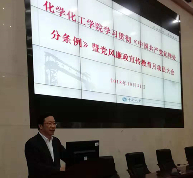 10月31日,英国正版365官方网站党委在化学楼133报告厅举行学习贯彻新修订的《中国共产党纪律处分条例》暨党风廉政宣传教育月动员大会。全体教职工和学生党支部支委以上干部共计190余人参加会议。院党委书记马跃如主持并作报告。