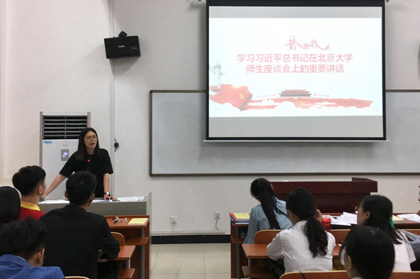第一项学习的是习总书记在北大师生座谈会上的讲话精神。支部书记杨宵老师讲到,习近平总书记对大学培养什么样的人和怎么培养人作出了自己的深刻见解并给出了一个明确答案——我们的教育要培养德智体美全面发展的社会主义建设者和接班人。联想到实际工作中,作为支部书记,她要求支部全体成员对照自身实际,找到自己的不足并努力改进使自己起到带头模范作用;而作为辅导员,她希望年级所有同学能广泛培养兴趣爱好,尽自己所能让更多同学能够全面发展。随后进行的两项内容学习,杨宵老师都提纲挈领联系实际,支部的同志们感触颇深。