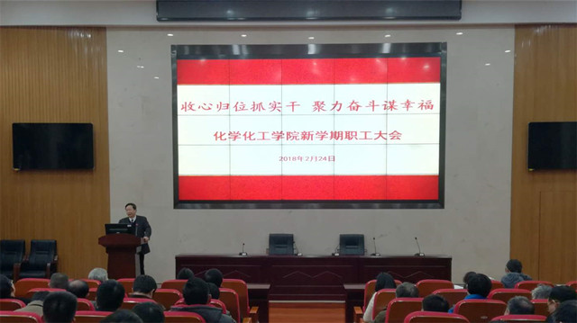 2月24日下午,英国正版365官方网站在新校区化学楼133报告厅召开2018年上半年新学期教职工大会。院领导班子及全体教职工参加会议。院党委书记马跃如、院长钟宏、副院长刘又年和副院长卢红梅发表讲话。院党委副书记刘有才主持会议。
