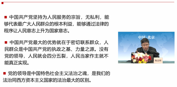 之后,陈志刚研究员指出:党的领导是人民当家作主和依法治国的根本保证,人民当家作主是社会主义民主政治的本质特征。中国共产党选拔领导干部不是唯票是举,而是广泛听取群众意见,发扬民主。同时,在讨论党、政、法三者关系时,党和法、政治和法治的关系不是截然对立的,而是密切关联、相互渗透的。