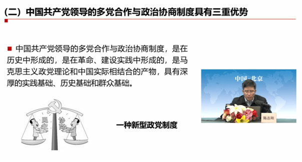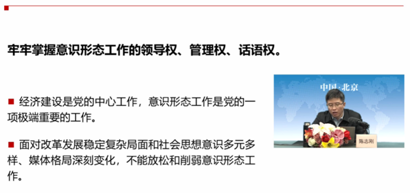 此次在线培训课的主题为《坚持中国共产党领导的制度优势》。陈志刚研究员从“坚持党委总揽全局、协调各方的原则”“坚持中国共产党领导的多党合作与政治协商制度”“坚持党的领导、人民当家作主与依法治国的统一”“坚持党对一切武装力量的绝对领导”以及“坚持和加强党对宣传思想文化工作的全面领导”等五个方面为我们上了一堂生动的党课。