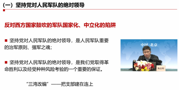然后,他谈到我们应该坚持党对人民军队的绝对领导。新时代的武警部队也必须听从党的指挥,实行中央军委主席负责制。坚决抵制军队非党化、非政治化和军队国家化等错误政治观点。贯彻落实党指挥枪的原则。