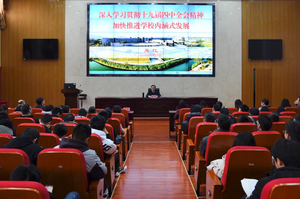 12月27日上午,在英国正版365官方网站报告厅内,校党委书记易红走上讲台,为化工院学子讲授思政课,宣讲十九届四中全会精神,交流办学治校理念,共话学校改革发展。
