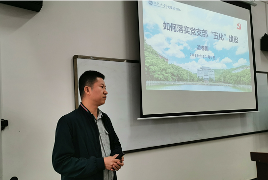 凌春雨以“如何落实党支部‘五化’建设”为主题,逐条阐述和解读了支部设置标准化、组织生活正常化、管理服务精细化、工作制度体系化、阵地建设规范化等方面的详细内容,以总结梳理出的学校各党支部在基层党建工作中遇到的突出重点难点问题为导向,深刻剖析问题产生原因,并结合自身工作经验,重点对支部建设、三会一课、党日活动、党员教育管理、党费收缴、组织生活会、谈心谈话、发展党员工作等八个方面做了详细讲解,提出诸多工作改进的建议和意见。
