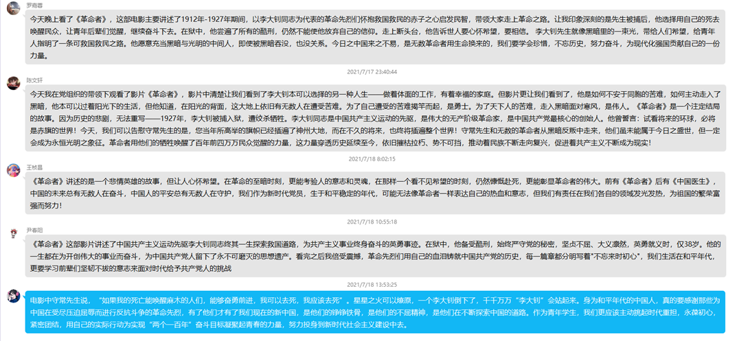 博士生党员夏莉红同志表示,影片完整展现了李大钊同志作为革命者在风雨如晦的旧中国上下求索,积极传播马克思主义的风采。作为中国最早的马克思主义者,他最早清醒。看着中国老百姓生活的惨状,当局的腐败,他没有放弃,而是屹立在光明的交界线旁,指引着民族前进的方向,无畏的他以身为桥,宁愿被黑暗吞噬,也要为中国开辟出一条康庄大道。新中国是无数革命先烈用鲜血和生命铸就的,新中国来之不易,中国特色社会主义来之不易,我们要继承李大钊先生的革命精神,用自己的青春来建设青春之国家、青春之民族,为中华民族的伟大复兴贡献青春和热血。