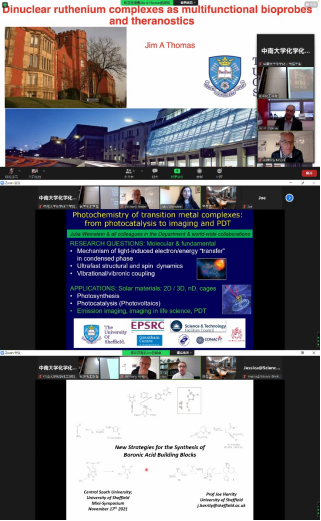 谢菲尔德大学Jim A Thomas教授以“Dinuclear ruthenium complexes as multifunction bioprobes and theranostics”为题进行了报告,主要讲述了双核钌配合物作为多功能生物探针在医学诊疗中的应用。Juila Weinstein教授在“Photochemistry of transition metal complexes: from photocatalysis to imaging and PDT”报告中就过渡金属配合物在光化学领域中的应用进行了讨论分享。Joe Harrity教授的“New strategies for the synthesis of boronic acid building blocks”报告中对含硼有机化合物的合成提出了几种新颖的合成策略,在杂原子有机物的设计方面具有一定的指导意义。