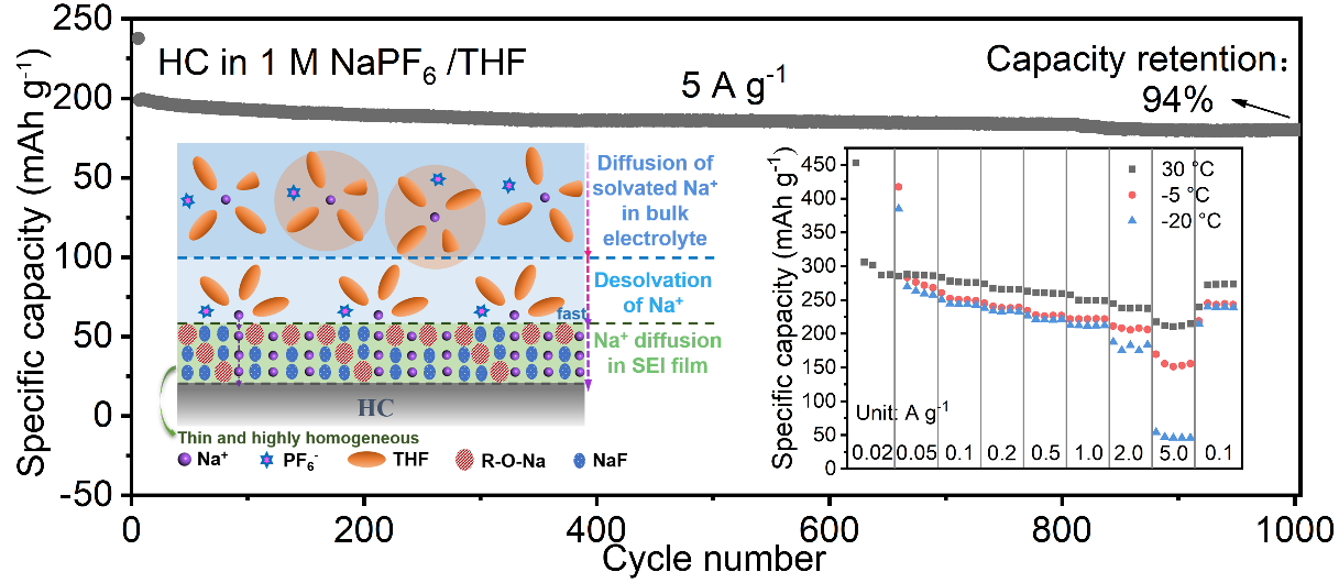 基于此,该团队提出了一种以环醚(四氢呋喃,THF)为溶剂,NaPF6为电解质盐的新型电解液体系,通过调控脱溶剂化能和构建均匀的SEI膜,显著优化了电极/电解液的界面化学性质。商业硬碳(HC)在此弱溶剂化结构的电解液中实现了5 A g-1高电流密度下212 mAh g-1的比容量,即使在-20 °C的低温下,也保持着优异的倍率性能(2 A g-1下比容量为175 mAh g-1)。