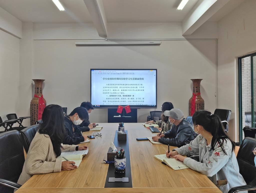 学工办全体老师围绕《中华人民共和国传染病防治法》、《高等学校新冠肺炎疫情防控技术方案(第五版)》、《教育部办公厅关于印发的学生疫情防控期间学习生活健康指南的通知》、教育部办公厅关于印发《学校教职员工疫情防控期间行为指引(试行)》的通知,四个文件内容展开学习交流,结合自身所带年级学生实际情况进行防疫相关应对策略研讨。