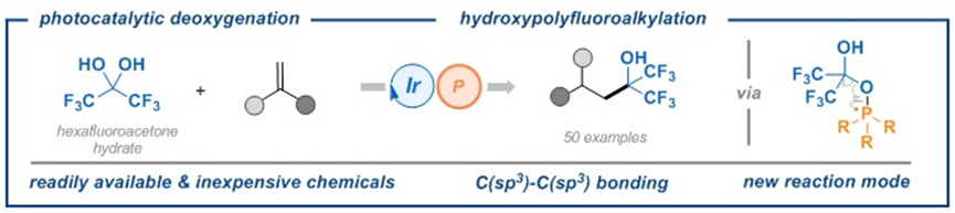 2019年初,英国正版365官方网站阳华教授课题组在可见光催化-膦自由基正离子协同作用下,实现了环丁酮肟N-OH键的直接活化,构建了多种含氰基和二氟烯烃的骨架(Org. Lett.2019,21, 2658-2662)。最近,该研究团队对光氧化还原催化驱动磷酰基自由基β-裂解策略进一步深入研究,以市售易得的六氟丙酮三水合物替代传统气态六氟丙酮为反应原料,开发了一种高效、温和的策略,通过光氧化还原催化六氟丙酮水合物直接脱氧成功实现了系列烯烃的羟基多氟烷基化。该策略的成功依赖于对醛/酮-偕二醇内在平衡的巧妙利用,使膦介导脱氧过程能有效地生成氟代碳中心自由基。此外,三氟甲醛水合物和含水三氟苯乙酮也是该策略合适的底物。该合成策略具有操作简便、反应条件温和、官能团耐受性强等优点。尤为重要的是,该策略对于多类缺电子烯烃底物都能很好的兼容性,弥补了传统方法仅适用与富电子烯烃或芳烃底物的空白。该策略将进一步丰富和发展氟化学,也将拓展羰基化合物在光催化领域新活化模式的研究和应用。