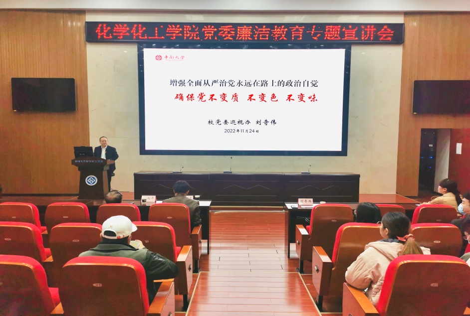 为进一步贯彻中共中央办公厅《关于加强新时代廉洁文化建设的意见》,落实学校纪委“六个一”工作思路和举措,营造风清气正的学院氛围。11月24日上午,校党委巡视办主任刘奇伟在英国正版365官方网站133报告厅作了题为“增强全面从严治党永远在路上的政治自觉,确保党不变质、不变色、不变味”的廉洁教育专题宣讲,学院党政班子成员,中层干部、办公室行政人员、教职工党员参加。会议由学院党委书记、纪检委员刘有才主持。