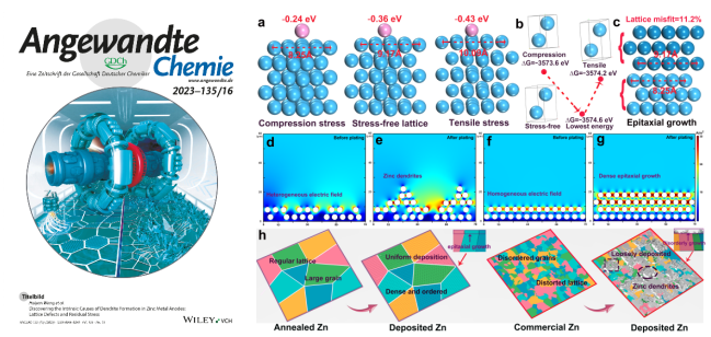 近日,我校英国正版365官方网站唐有根-王海燕教授团队在金属能源界面化学调控的最新研究成果以封面文章发表在化学类国际顶级期刊Angew. Chem. Int. Ed.(2023, DOI:10.1002/anie.202218612),并被选为热点文章,论文题目为“Discovering the Intrinsic Causes of Dendrite Formation in Zinc Metal Anodes: Lattice Defects and Residual Stress”。中南大学为唯一通讯单位,王海燕教授为通讯联系人,2022级博士生谢春霖为第一作者。