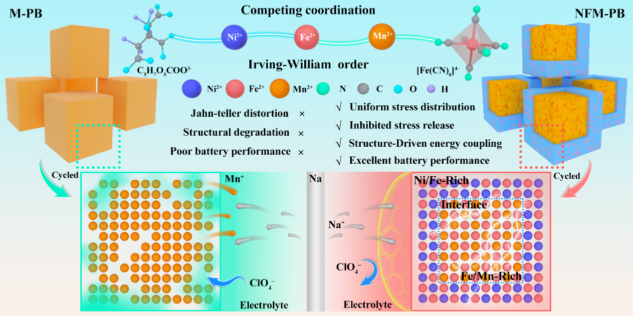 组分高度可调制的普鲁士蓝类似物(PBAs)被认为是多种储能体系种的重要前体和关键电极。作为钠离子电池正极材料,高理论比容量的锰基普鲁士蓝(Na2Mn[Fe(CN)6])面临着Jahn-Teller效应引发的结构劣化和水电解驱动的电压振荡(能量耦合效应)。目前,传统的组分优化策略通过设计TMN6八面体中心原子的种类和相对含量,单向地抑制了源于MnN6八面体的应力积累和释放,这导致正极材料的结构稳定性存在上限。因此,进一步发展普鲁士蓝类似物的组分可调特性,扩大其改性边界,对于开发先进普鲁士蓝类似物正极材料具有重要意义。