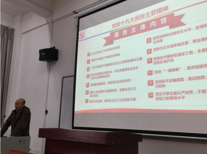 刘有才副书记首先阐述了党的十九大召开的伟大意义,指出党的十九大是在全面建成小康社会决胜阶段、中国特色社会主义进入新时代的关键时期召开的一次十分重要的大会。他从13个部分深刻分析了十九大报告的内容,并针对性地进行了解读。刘书记紧扣党的十九大报告,紧紧围绕习近平新时代中国特色社会主义思想这个主线,深入浅出地对党的十九大提出的新思想、新论断、新要求、新任务作了全面系统而又突出重点的解读。同时,刘书记结合学院发展实情,勉励支部同志将十九大精神贯穿学科建设、人才培养、科学研究等方方面面,用习近平新时代中国特色社会主义思想作为行动指南,牢记使命和责任,为培养创新拔尖人才,建设一流学科而奋斗,为实现中华民族伟大复兴的中国梦而奋斗。