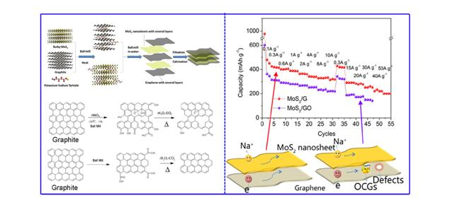 成本低廉的钠离子电池在规模储能领域具有良好的应用前景,是目前的研究热点之一。由于锂离子电池中商业化的石墨和硅基类材料储钠性能不佳,因此开发高性能的钠离子电池负极仍然面临很大挑战。MoS2具有良好的层状结构及较高的理论容量(670mAhg-1),是一种较有发展潜力的钠离子电池负极材料。然而较差的电子导电性以及充放电过程中巨大的体积变化导致了其电化学性能不佳,限制了其商业化应用。通过与石墨烯复合可显著提升MoS2的电化学性能,然而该体系目前也存在一些科学和工程问题:1、通常石墨烯的制备方法采用的是氧化还原法,在石墨烯表面会引入大量的缺陷和含氧官能团,这些对复合材料的电化学性能会有多大影响?2、虽然目前报道了多种石墨烯制备方法,但高质量石墨烯的大规模、低成本制备仍然是一大挑战。唐有根教授团队通过DFT计算发现石墨烯表面的缺陷和含氧官能团会显著增加钠离子在MoS2/graphene异质界面的扩散能并降低其导电性。为了获得高质量低成本的材料,该团队设计了一种非常简单的化学插层-球磨辅助物理剥离的方法,直接以商业化的块状MoS2和石墨为原料,得到了缺陷及含氧官能团较少的MoS2/graphene复合材料。该复合材料在钠离子电池中显示了非常优异的倍率性能,在50 A g?1(≈75C)的电流密度下,仍可保持201 mA h g?1的放电容量,优于相关文献的报道结果。同时,该材料也显示了优异的循环性能,在0.3A g-1下250次循环后,容量保持率在95%以上。系列的测试表征表明,缺陷及含氧官能团较少的MoS2/graphene复合材料具有更高的离子扩散系数及电子电导率,进一步验证了理论计算结果。该工作揭示了异质界面调控对于获得高性能MoS2/graphene复合材料的重要性,也为其他体系异质界面的设计和调控提供了良好借鉴。