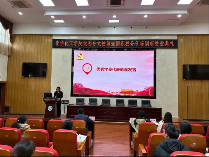 结业典礼在庄严肃穆的国歌声中拉开序幕。首先,班导师肖茜斤对第50期培训班的整体状况进行总结,全面回顾了这一阶段的培训历程,并宣读了优秀学员标兵以及优秀学员的名单。同时她对各位学员提出殷切希望:在今后的道路上,要能够继续保持这种积极进取的学习态度,不断深化对党的理论知识的理解和掌握,以更高的标准严格要求自己,在学习和生活中发挥先锋模范作用,以实际行动向党组织靠拢,争取早日成为一名光荣的中国共产党党员。