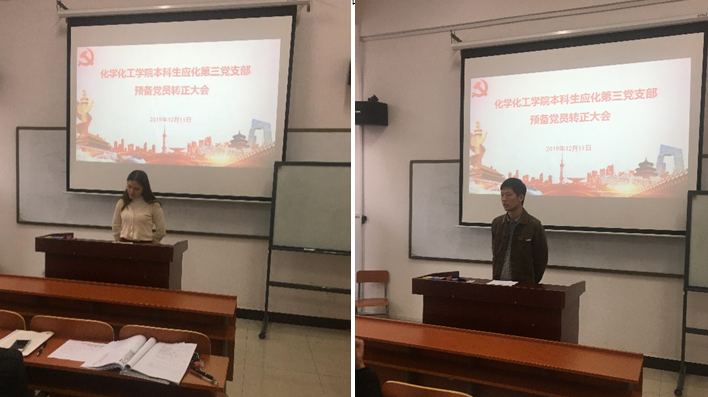 2019年12月11日下午3点,本科生应化第三党支部于英国正版365官方网站126教室召开预备党员转正大会,对石海文、孙帅威、古丽妮尕尔·依麻木和黄祉翔四名预备党员的转正申请进行了讨论和表决。本次会议应到18人,实到18人,其中有表决权的正式党员4人。会议由支部书记张沛毅主持。
