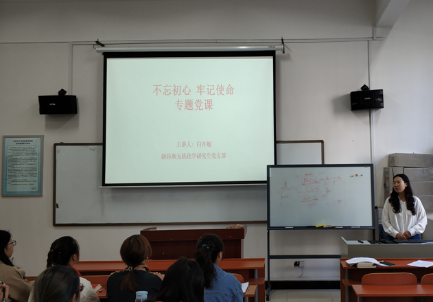 10月31日下午,制药和无机化学研究生党支部书记白丹妮同志在化学楼123教室为党员同志们讲授了“不忘初心、牢记使命”主题教育专题党课。