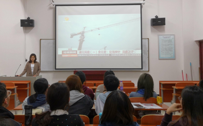 学习会由主题为“魂归洞庭余元君:定海神针,洞庭之子”的新闻片段的播放拉开了帷幕。通过观看两则关于余元君事迹报道的新闻,对余元君同志的逝去事发经过有了初步的了解以后,范帆同志带领大家一起学习了余元君同志生前的经历以及其为洞庭水利工程做出的贡献。