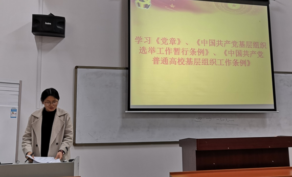 在孙青同志的带领下,全体与会人员深入学习了《党章》《中国共产党基层组织选举工作暂行条例》《中国共产党普通高校基层组织工作条例》等内容。新修订的《党章》是一部更加完善和符合时代要求的章程。对每一名党员提出了更高的要求。