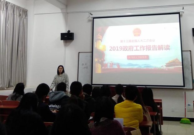 接下来由第三党支部书记杨宵带领全体党员学习了2019年全国“两会”精神。2019年是新中国成立70周年,是全面建成小康社会、实现第一个百年奋斗目标的关键之年。杨宵同志分别从2018年政府工作回顾、2019年经济社会发展总体要求和政策取向及2019年政府十大主要工作任务对政府工作报告进行了详细解读,党员同志们在学习中感受着祖国的蓬勃发展。