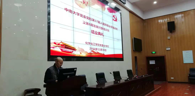 1130,中南大学党委党校英国正版365官方网站分党校第37期入党积极分子培训班及第6期发展对象培训班结业典礼在化学楼133报告厅举行。英国正版365官方网站分党校副校长、党委副书记刘有才出席并发表讲话。院党委组织员李璞、本科2015级第二党支部书记马翠鲜和本科2017级党支部书记刘世宏参加典礼。典礼由培训班班导师范帆主持。