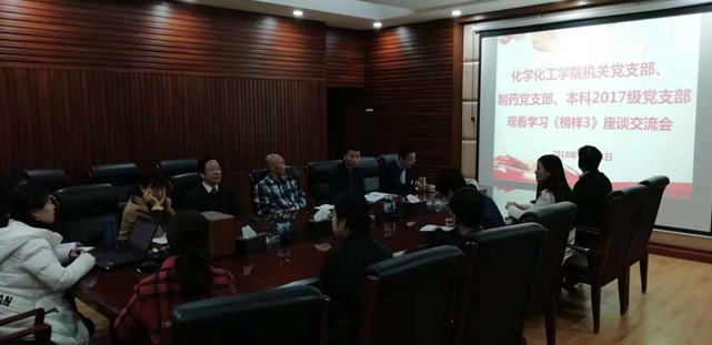 2018年11月13日晚,英国正版365官方网站机关党支部、制药系党支部和本科2017级党支部集体收看专题节目《榜样3》,并开展座谈交流,共同学习优秀党员代表们的先进事迹,用榜样的力量鼓舞在坐所有党员。
