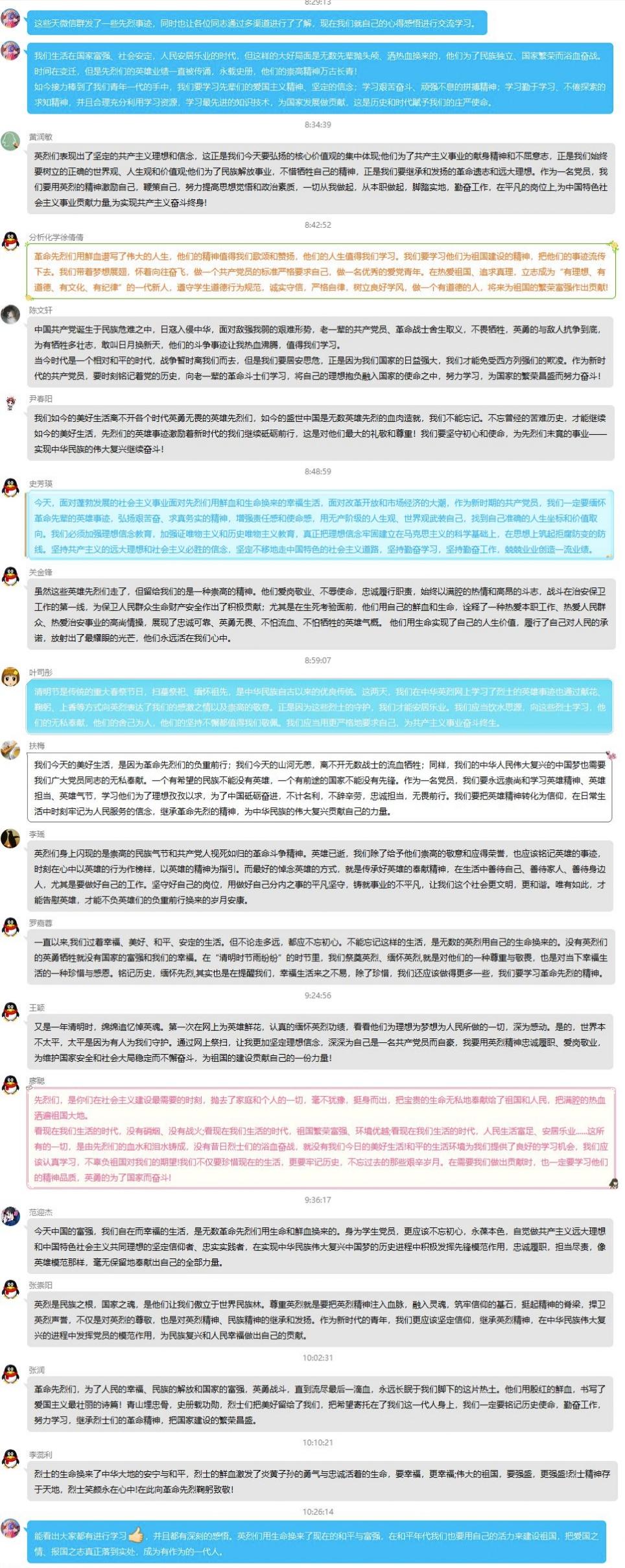 支部每位同志在线上就学习英雄事迹及祭奠英烈分享了自己的深刻感悟。李瑶同志表示:我们生活在国家富强、社会安定、人民安居乐业的时代,但这样的大好局面是无数先辈抛头颅、洒热血换来的,他们为了民族独立、国家繁荣而浴血奋战。英烈们身上闪现的是崇高的民族气节和共产党人视死如归的革命斗争精神。英雄已逝,我们应该铭记英烈的英雄事迹,时刻在心中以英雄的行为作榜样,以英雄的精神为指引。王颖同志就第一次 “网上祭扫”提出了自己的深刻感受,她表示:第一次在网上为英雄献花,认真的缅怀英烈功绩,看看他们为理想为梦想为人民所做的一切,深为感动。世界本不太平,太平是因为有人守护。通过网上祭扫了解先烈们的事迹,让我更加坚定理想信念,并深深为自己是一名共产党员而自豪,我愿意用英烈精神忠诚履职、爱岗敬业,为维护国家安全和社会大局稳定而不懈奋斗,为祖国的建设贡献自己的一份力量!最后,党员同志对本次网上祭扫活动评价颇高,一致表示我们应当把英雄精神转化为信仰,在日常生活中时刻牢记为人民服务的信念,继承革命先烈的精神,为中华民族的伟大复兴贡献自己的力量。