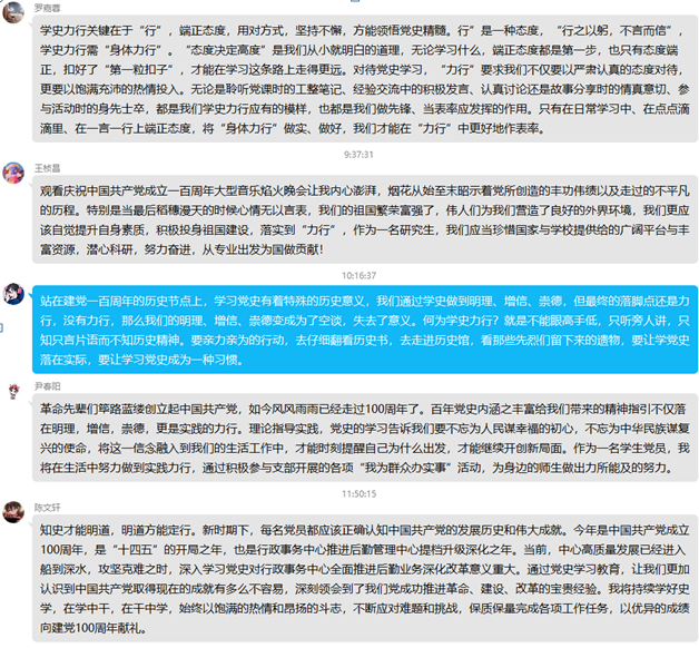 最后,王桢昌同志组织大家开展了“学史力行”专题学习研讨,支部党员尹春阳、罗嘉蓉、陈文轩、王桢昌、范迎杰五位同志围绕党史学习教育分享了个人的学习体会。尹春阳同志表示:理论指导实践,党史的学习告诉我们要不忘为人民谋幸福的初心,不忘为中华民族谋复兴的使命,将这一信念融入到我们的生活工作中,才能时刻提醒自己为什么出发,才能继续开创新局面。作为一名学生党员,我将在生活中努力做到实践力行,通过积极参与支部开展的各项“我为群众办实事”活动,为身边的师生做出力所能及的贡献。罗嘉蓉同志认为:对待党史学习,“力行”要求我们不仅要以严肃认真的态度对待,更要以饱满充沛的热情投入。无论是聆听党课时的工整笔记、经验交流中的积极发言、认真讨论还是故事分享时的情真意切、参与活动时的身先士卒,都是我们学史力行应有的模样,也都是我们做先锋、当表率应发挥的作用。只有在日常学习中、在点点滴滴里、在一言一行上端正态度,将“身体力行”做实、做好,我们才能在“力行”中更好地作表率。