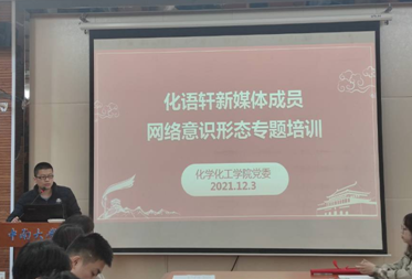 为进一步提升化语轩新媒体成员思想政治素养、强化网络意识形态风险防范能力,12月3日,学院党委在新校区化学楼“初心讲堂”开展化语轩新媒体成员党史学习教育暨网络意识形态工作专题培训活动。培训会由华绪雨老师主持,新媒体中心主任、学院红色宣讲团成员于悦凡老师主讲党史学习教育党课,院党委委员、专职组织员李璞老师作网络意识形态工作专题培训。全体新媒体成员参会。
