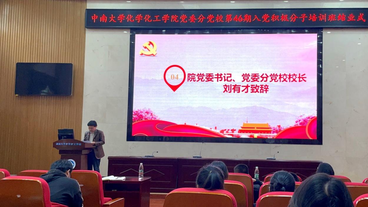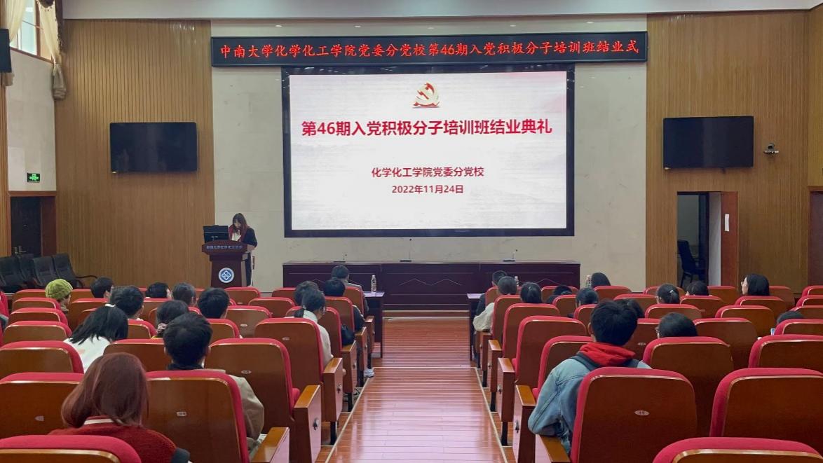 2022年11月24日中午,英国正版365官方网站党委分党校在化学楼133报告厅举行第46期入党积极分子培训班结业典礼。院党委书记、分党校校长刘有才出席并致辞。党委委员、专职组织员、分党校办公室主任李璞同志,院党委专职组织员汪菁垚同志及培训班全体学员参会。结业典礼由培训班班导师胡雨琪同志主持。