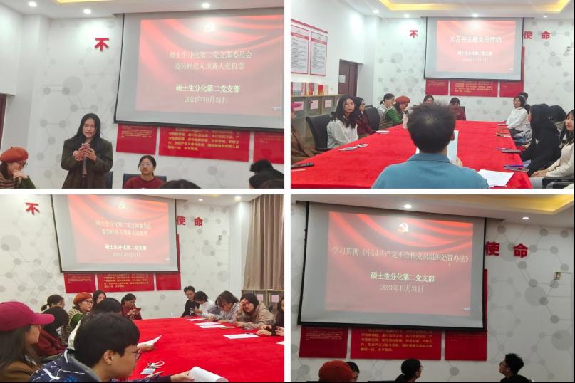 10月31日,硕士生分化第二党支部在新校区化学楼132党员活动室开展十月份主题党日活动暨全体党员大会。会议由党支部书记庄曜宇同志主持,支部全体党员参加。会议分为三个部分:集中学习习近平总书记最新重要讲话重要指示批示精神和发布的重要文章;开展《中国共产党不合格党员组织处置办法》专题学习;开展无记名投票推荐补选支部组织委员候选人预备人选。