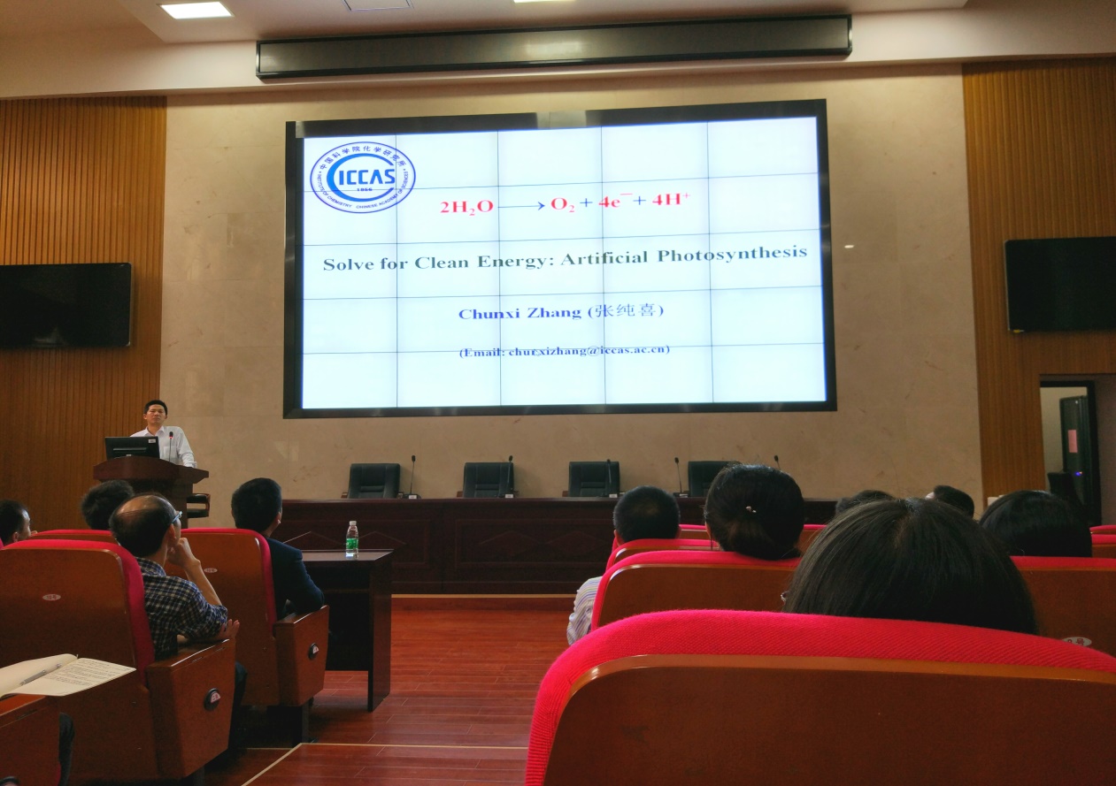 此次报告会,张教授介绍了水裂解催化剂开发的必要性,高等植物的PS I和PS II过程,及蓝细菌的PS II过程,表明该生物过程能量转换效率接近100%,且具有高安全性,并对比了PS I和PS II两个过程。通过氧放出中心(OEC)催化由植物、藻类和蓝细菌将水光合分裂成氧,OEC的合成模拟物由与蛋白质基团结合的不对称锰-钙-氧簇组成,可以促进对生物水氧化的结构和化学决定因素的了解掌握,并提出开发用于人工光合作用的优良催化剂。其课题组合成了一个Mn4Ca群集类似于天然OEC在金属氧核心的结合蛋白组。天然OEC合成簇可以经历四个氧化还原转变,并显现可归属于氧化还原和结构异构的两个磁共振信号。 与先前合成的Mn3CaO4立方烷簇的比较,表明第四锰离子确定天然OEC的氧化还原电位和磁性。由此合成了包含Mn3SrO4的立方烷簇,并在含有Sr(2+)的PS II过程中观察到所有类型的μ-O(2-)部分的新型异金属MnSr复合物,其提供了OEC的新合成模型。