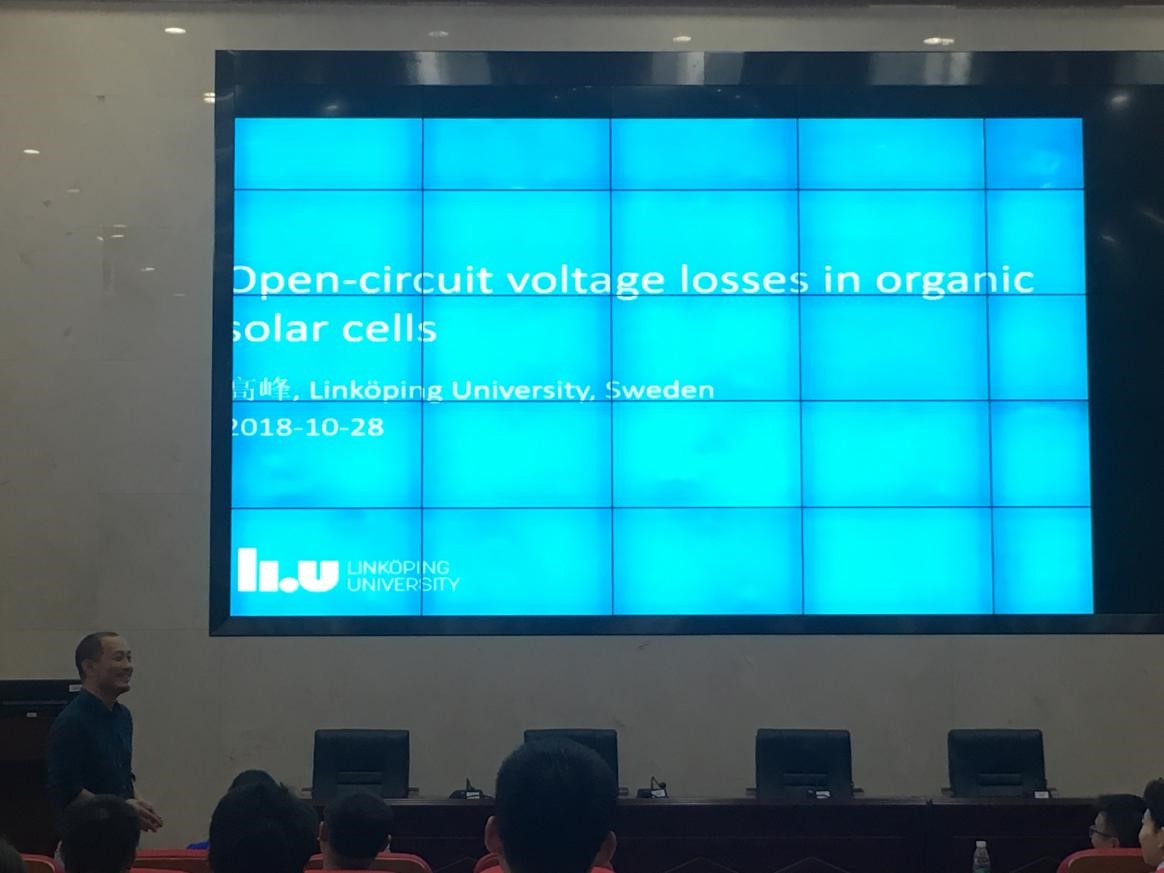 2018年10月29日下午3:00,中南大学新校区化学楼133报告厅举办了题为“Decrease the photovoltage losses in organic solar cells”的学术讲座,报告人是瑞典林雪平大学高峰教授。报告会由邹燕萍教授主持,来自全院相关学科的师生们聆听了高峰教授的精彩讲座。