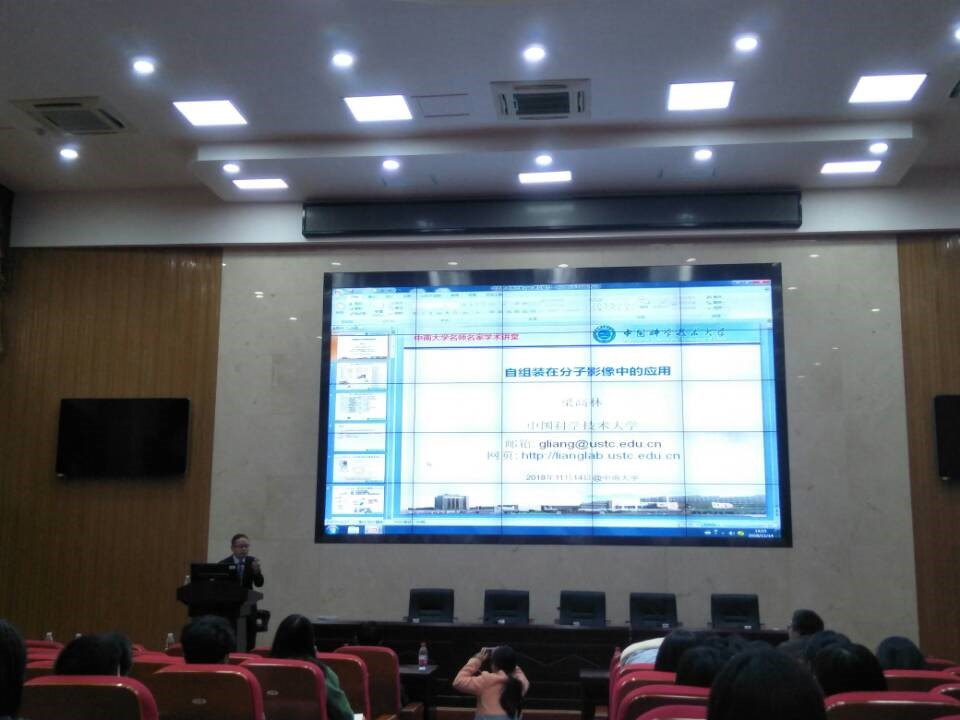 2018年11月14日下午14:00,中南大学新校区化学楼133报告厅举办了题为“自组装在分子影像中的应用”的学术讲座,报告人是梁高林教授。报告会由易小艺教授主持,来自全院相关学科及其他学院的师生们聆听了梁高林教授的精彩讲座。