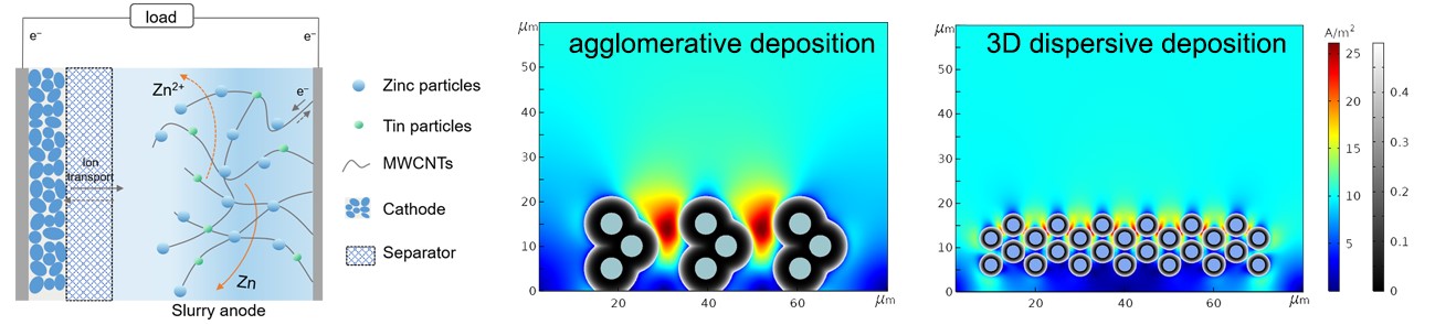 鉴于此,唐有根-王海燕团队首次报道了一种用于AZIBs由活性金属Zn-P、锡粉添加剂和分散在硫酸锌电解液中的多壁碳纳米管(MWCNTs)与聚丙烯酰胺(PAM)组成的半固体锌浆料负极。PAM电解液添加剂具有各种重要功能,包括Zn-P的腐蚀抑制剂、流变网络的增稠剂和MWCNTs的分散剂。在半固体浆料中均匀分散的MWCNTs构建了一个强大的三维离子和电子传输的导电框架。此外,作为沉积种子的锡粉添加剂可以有效地避免小尺寸颗粒的优先溶解所引起的锌的团聚沉积,这一点已通过有限元方法、3D-X射线微型计算机断层扫描和扫描电子显微镜得到证明。弹性流变学网络缓解了锌溶解/沉积过程中的体积变化,并通过均匀的三维沉积抑制了锌枝晶的生长。使用半固体浆料负极的全电池的维护和再生只需要更换浆料和隔膜,而其他成分保持不变,这表明半固态锌浆全电池在大规模储能的集成装置中具有良好的潜力。