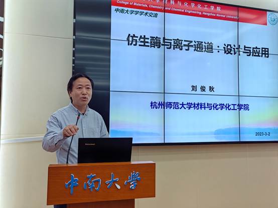 刘又年院长代表学院对章鹏飞院长一行到英国正版365官方网站交流表示热烈欢迎,并简单介绍了出席会议的嘉宾。随后,国家杰青、杭州师范大学刘俊秋教授给在场的师生作了“仿生酶与离子通道:设计与应用”主题学术报告。刘教授从仿生酶与离子通道的设计思路、模型选择及纳米酶性能等进行了详尽的介绍,整个讲座过程气氛热烈,刘教授和在场的师生进行了深入的互动交流,在场的师生表示“这是一场学术盛宴,刘教授的讲座精彩纷呈,做的工作出神入化,让我们受益匪浅”。学术报告在师生们热烈的掌声中圆满结束。