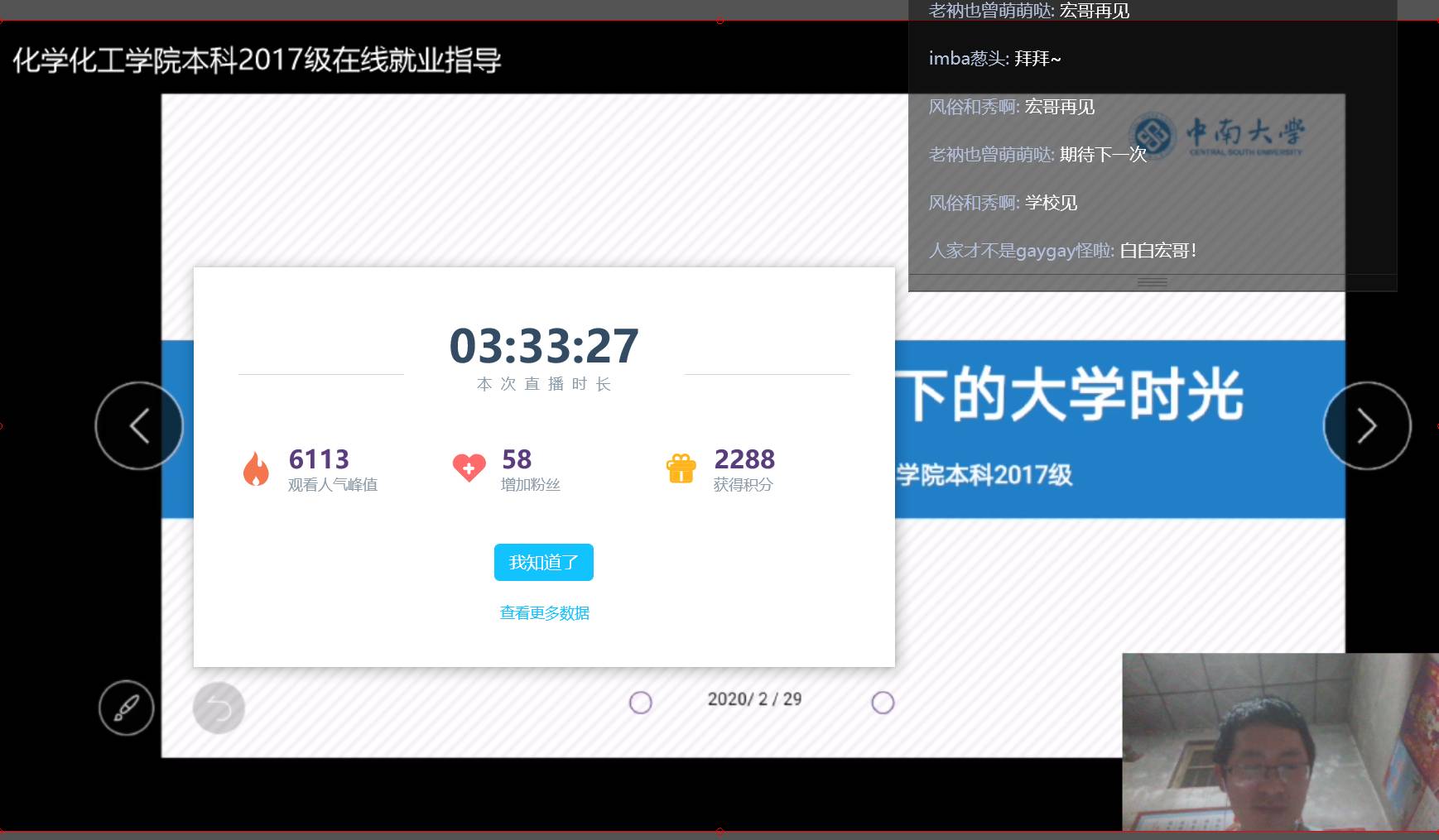 为保证2020年春季学期工作顺利开展,帮助学生顺利过渡到学习状态,做好居家学习生活安排、职业生涯规划以及简历制作等方面内容,2月29日晚,英国正版365官方网站年级大会在bilibili直播间举行,年级大会由辅导员刘世宏主持。会上,294名同学及部分学生家长与支持人一起,就后期学习安排、疫情防控、新学期相关重点工作安排、个人发展规划以及简历制作等等进行了线上交流。
