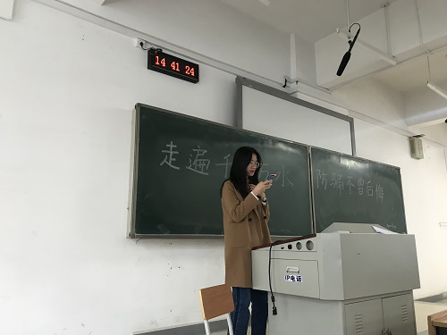 接下来就是同学们的分享环节。有的同学说自己从来没有被骗过,但是身边的朋友却遇到过,包括但不限于:拨打电话来要求转钱;盗取QQ号或者微信号向好友要钱;在发放的小广告上传播不善信息;向大学生求助乞讨并借此抢夺手机或直接绑架;以指路为借口绑架拐卖女大学生;在出租车乘车后排落座时发现前排座位下藏人等。也有的同学提到遇到此类情况时应当尽快向身边权威性的人求助,比如当遇到人指路时,可以将其带到我学校保安室;或者发现可疑人员后直接报警;还有同学讲到走夜路的时候最好不要戴耳机以免不能发现不法分子尾随。