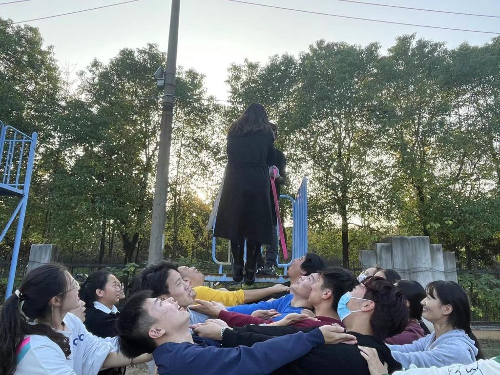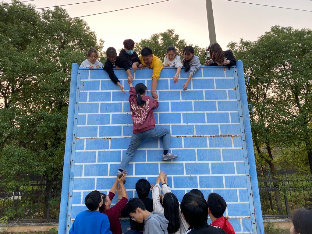最后,同学们被带领至“毕业墙”前,大家通过协商与配合,下层同学用身体搭起“人梯”,上层同学伸出自己的双手给予接应,让其他同学依次攀爬翻过。经过大家的不懈努力与坚持,最终获得了该项目的成功。