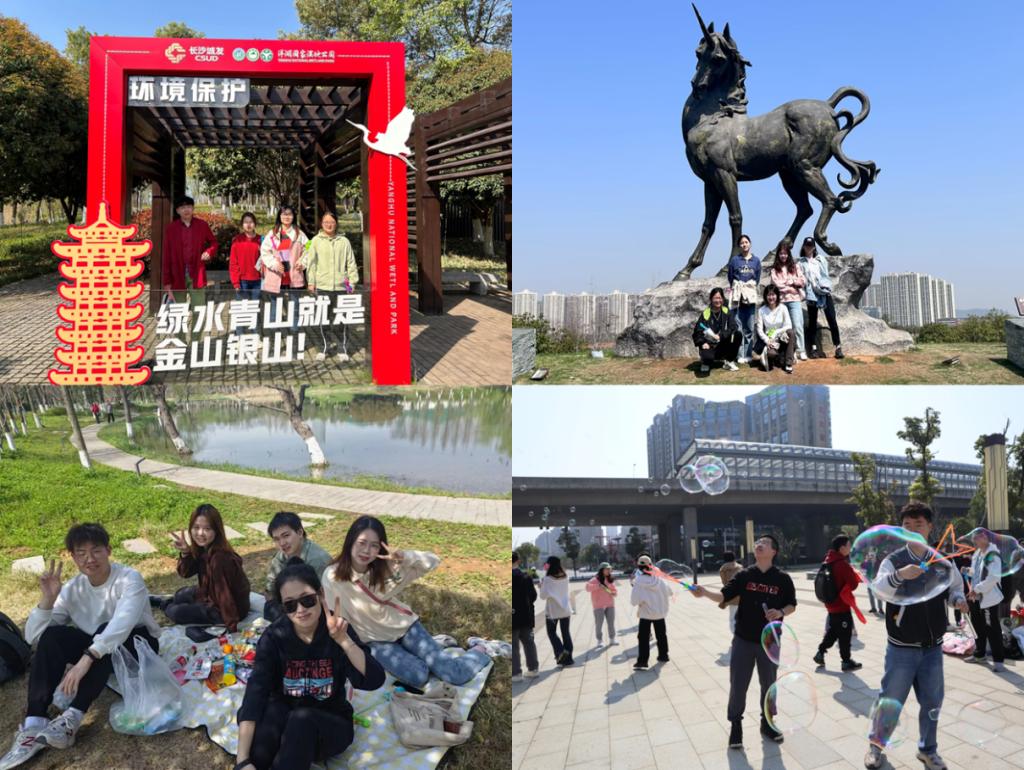 活动过程中,同学们满怀活力,奔走在各个打卡点之间,在地标前留下了各具特色的合照。本次活动还为大家准备了泡泡机、飞盘和风筝等集体娱乐用具供同学们自由活动,同学们在洋湖湿地公园拍照赏花、共同野餐、参观湿地科学馆,并有拍摄短视频记录生活。同学们表示,此次活动很好的缓解了科研学习的单调,帮助他们转换场景,发现自然之美,探寻生活新方式。