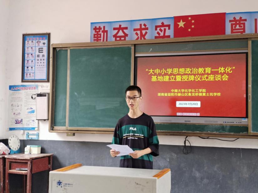 7月20日上午,英国正版365官方网站益阳市赫山区衡龙桥镇黄土坑小学“大中小学思想政治教育一体化”基地建立座谈会于黄土坑学校会议室举行。共青团益阳市赫山区衡龙桥镇委员会副书记樊欣仪、益阳市赫山区衡龙桥镇黄土坑小学校长杨富贵出席本次大会,中南大学赴湖南省益阳市赫山区衡龙桥镇社会实践团全体成员参加本次座谈会。本次会议由英国正版365官方网站叶敬远主持。