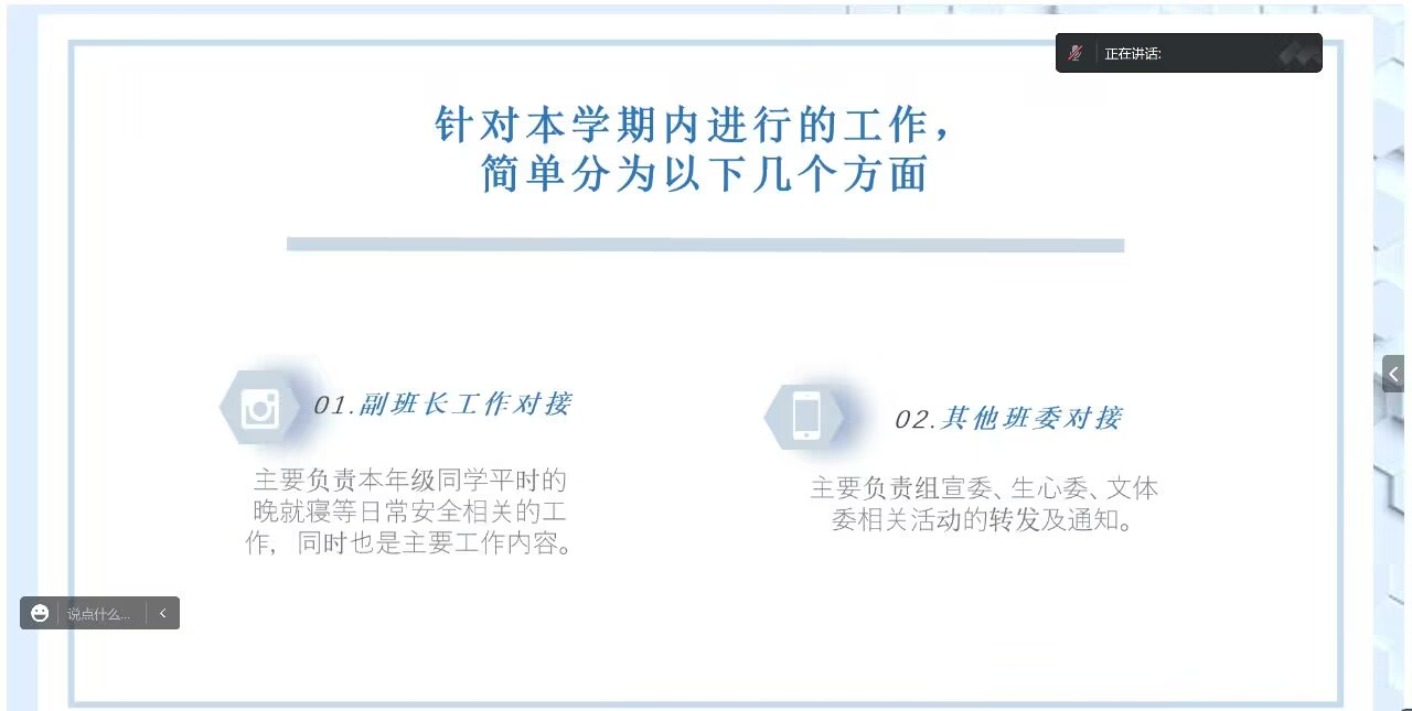 首先各班长进行述职,各班班长结合本班情况,对本班学习情况、思想建设、活动开展、存在的问题进行分析,同时做出工作计划,在班级活动中,各班各色,有许多可鉴之处,如男生节、同学生日送礼物等人文关怀,班级知识答疑群的互帮互助,完善班级德育分系统协助班级工作开展等,辅导员根据各班情况答疑解惑。