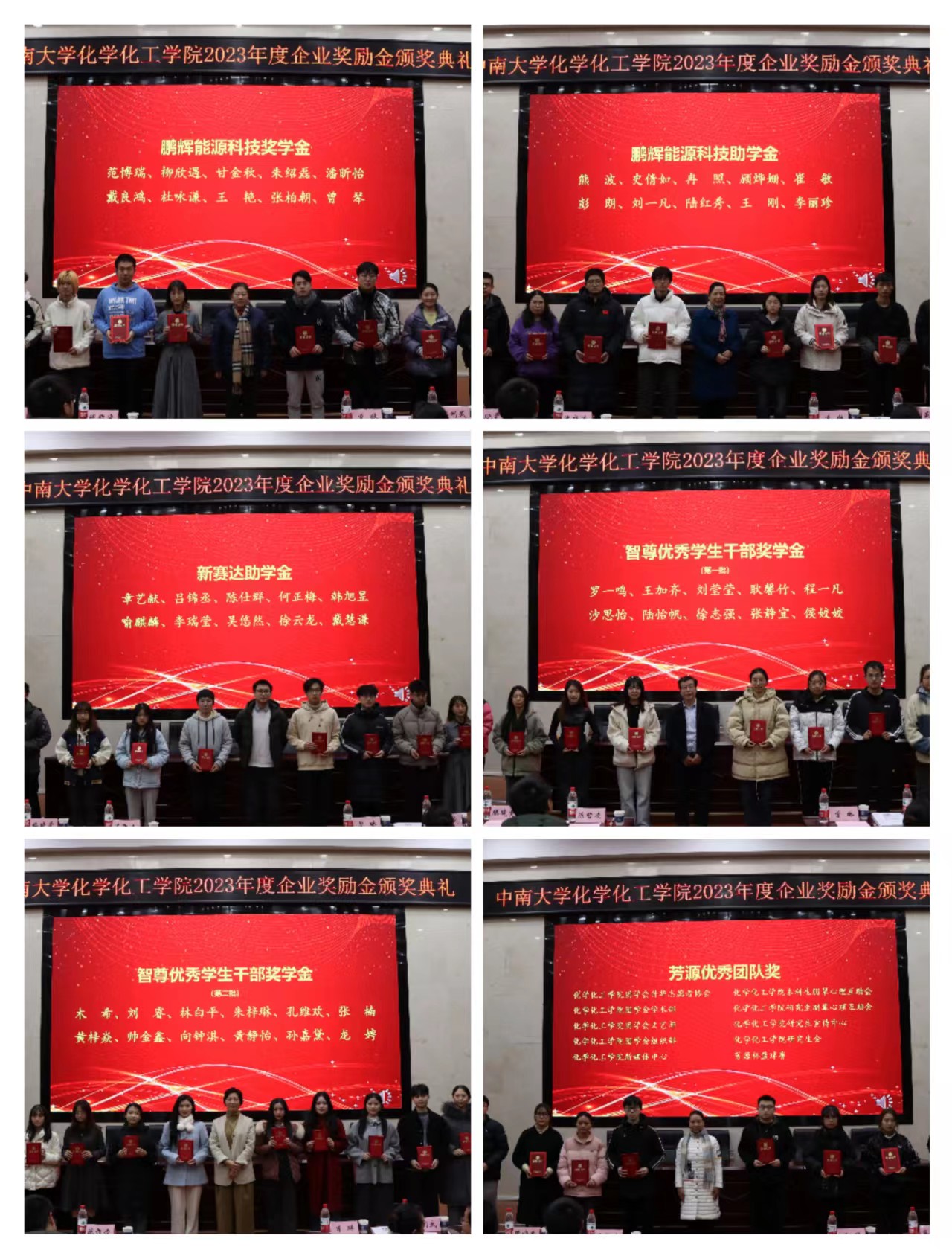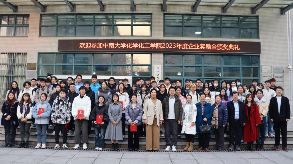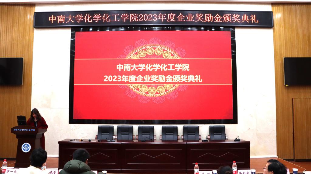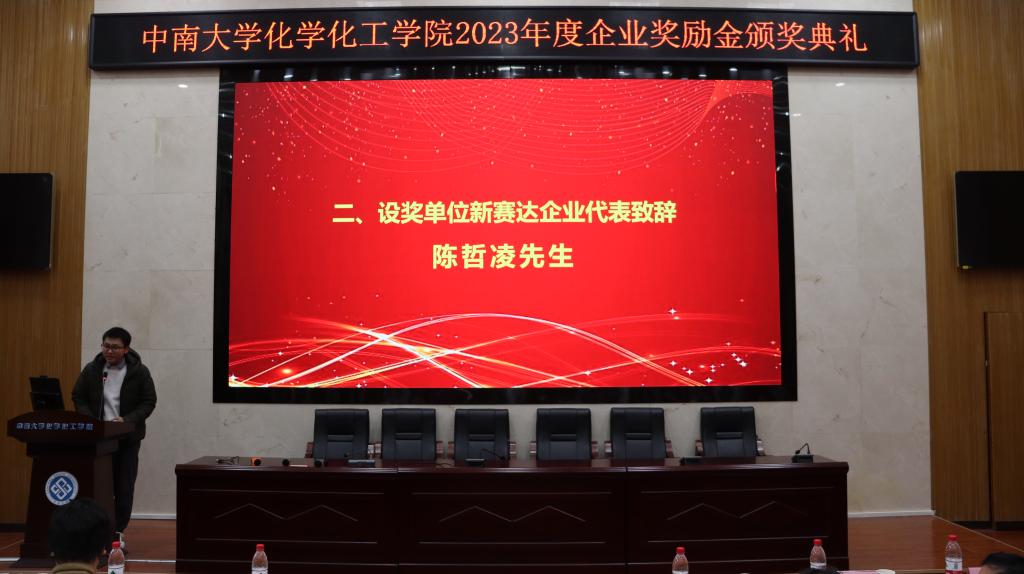 12月27日下午,英国正版365官方网站2023年度企业奖励金颁奖典礼在化工楼133隆重举行。惠州市新赛达实业有限公司董事长助理陈哲凌、中南大学教育基金会副秘书长曾琳、学院党委副书记滕晓雯、关工委副主任蒋利武、关工委委员罗一鸣、刘常青、学工办全体辅导员、获奖个人及团队代表出席此次颁奖典礼。颁奖典礼由学院辅导员胡雨琪主持。