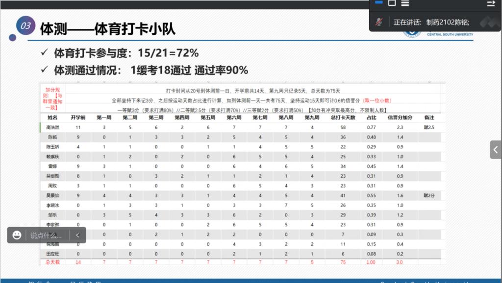首先各班长进行述职,各班班长对本班学习情况、思想建设、活动开展等方面进行分析,同时进行未来展望。针对大三“体测难”的问题,许多班级积极开展体育打卡小队活动,提高同学们进行体育锻炼的积极性,降低体测挂科率,对其他班级具有借鉴意义。同时,各班班长提出工作时的困惑,辅导员根据各班情况提出指导意见。