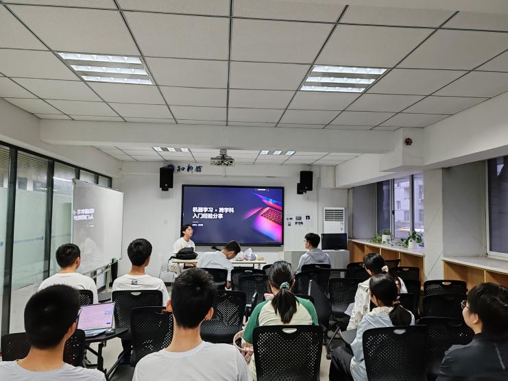 首先由苗子阳学长进行跨学科“前研”分享,苗子阳学长以生动的例子引入机器学习的概述,分析跨学科分享的必要性,举例机器学习与化学研究的结合,帮助非计算机专业同学入门机器学习与人工智能,可以将计算机融入大创项目。