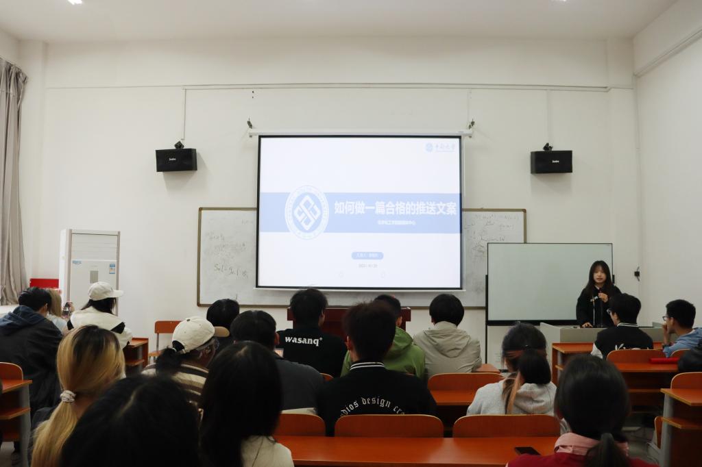 最后,新媒体中心主任谢曼秋以“如何做一篇合格的推送文案”为题,依次讲解了推文标题、开头、主体结构和结尾的写作技巧,并指出在写作过程中需注意逻辑严密、不能出现错别字和病句。
