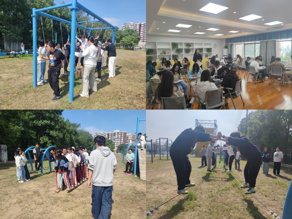 室外团辅活动同样精彩纷呈。在蓝天白云下,新生们首先通过“破冰游戏”进一步打破了隔阂,形成了轻松愉快的氛围。接着,“乒乓球接力赛”不仅考验了大家的反应速度和团队协作能力,还激发了新生们的竞争意识和拼搏精神。在“双人同行”“无轨电车”和“低空荡木桥”项目中,新生们需要相互扶持、共同进退,这些活动不仅锻炼了大家的身体,更培养了团队合作和相互信任的精神。
